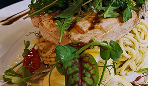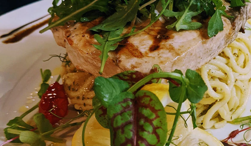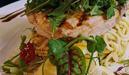 Griddled swordfish steak served on a nest of pesto spaghetti, topped with peppery wild roquette and shaved Parmigiano.